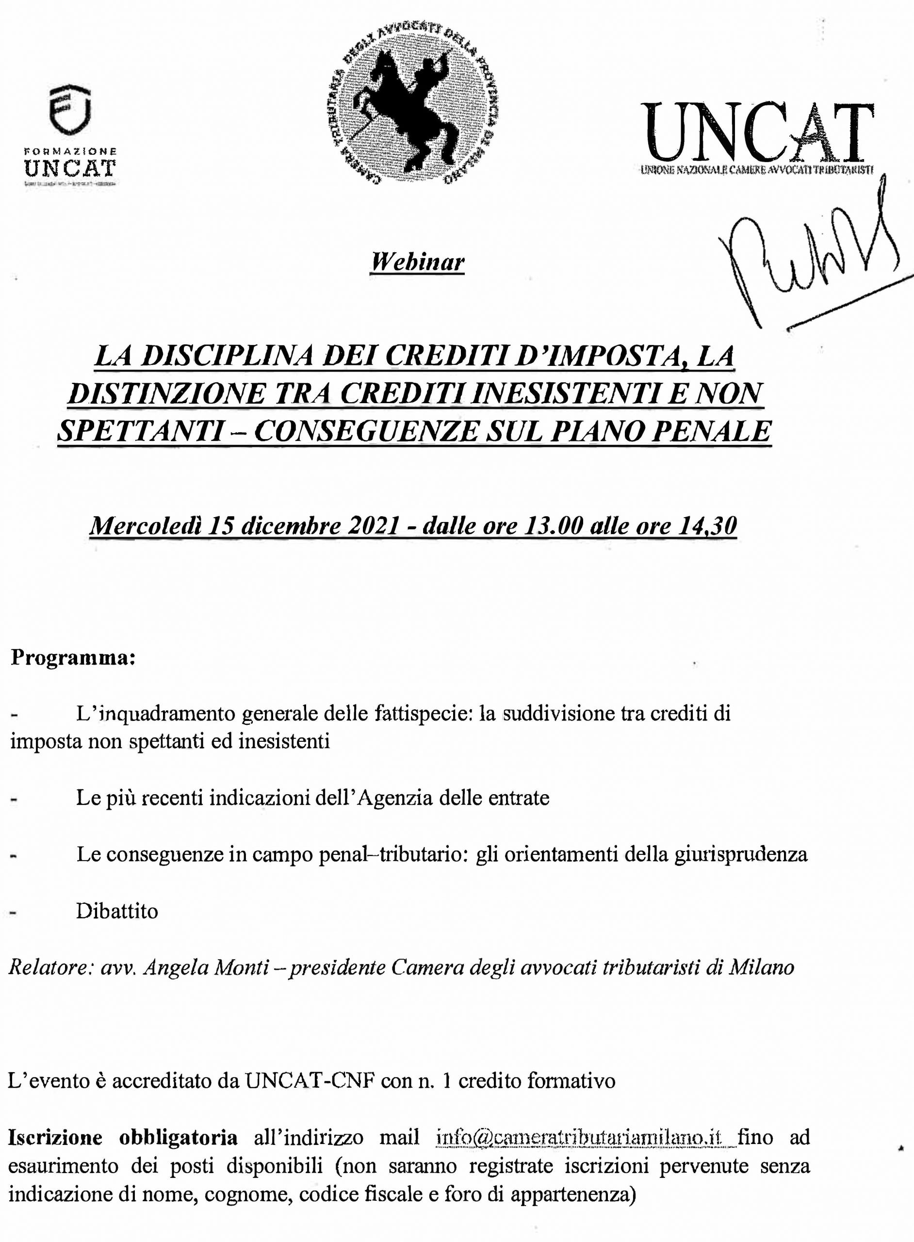 Giorno 15 dicembre 2021 FORMAZIONE PROFESSIONALE ” LA DISCIPLINA DEI DEBITI D’IMPOSTA…” (org. UNCAT)
