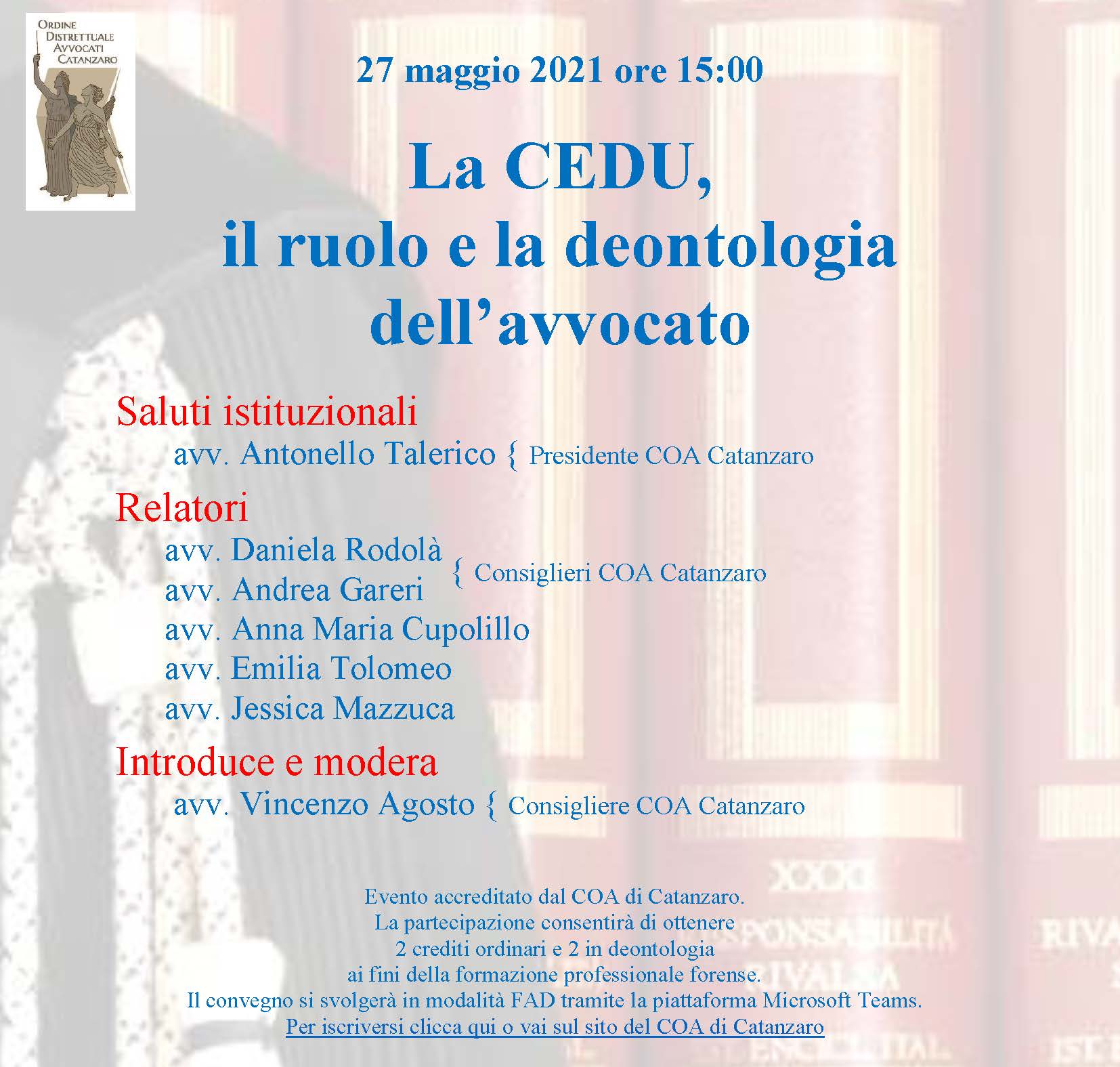 NELL’IMMINENZA DELL’EVENTO GLI ISCRITTI RICEVERANNO UNA COMUNICAZIONE CONTENENTE LE REGOLE PER L’ACCESSO ALLA PIATTAFORMA TEAMS